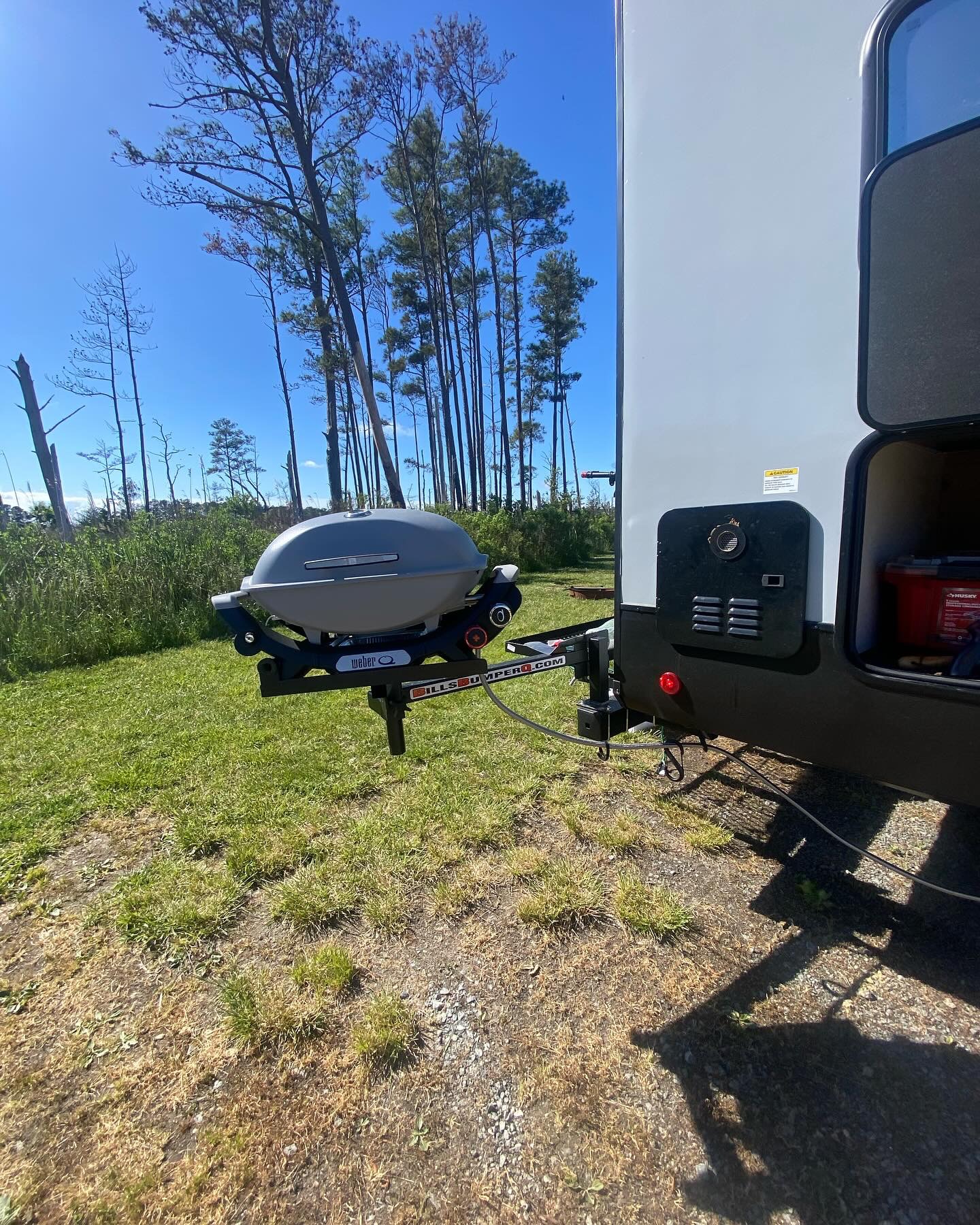 The rv grill bumper mounting bracket allows you to securely store and easily use the rv grill anywhere and at any time. Storing the rv grill securely outside the camper eliminates space and odor concerns when it comes time to pack up and head home. BillsBumperQ comes complete with a high end stainless steel LP gas rv grill, but if you already have a favorite rv grill we will create a custom rv grill bumper mount just for you, call for pricing. Check out the product descriptions for more information on the BillsBumperQ that is right for you.